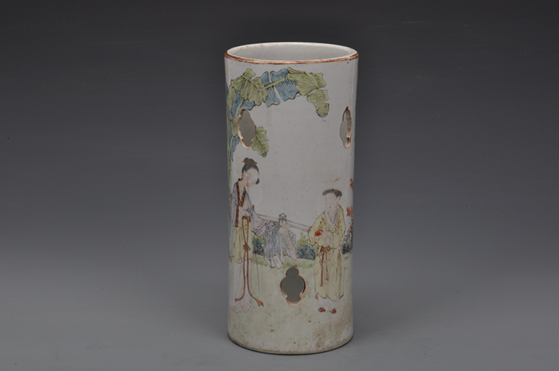 清光绪二十五年梅春茂浅绛绿彩仕女游园图帽筒