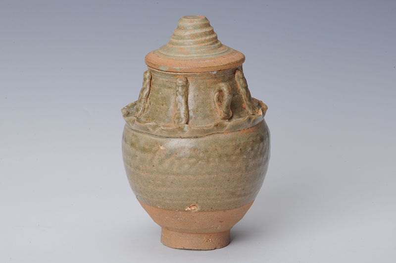 现代青釉堆塑人物纹盖瓶