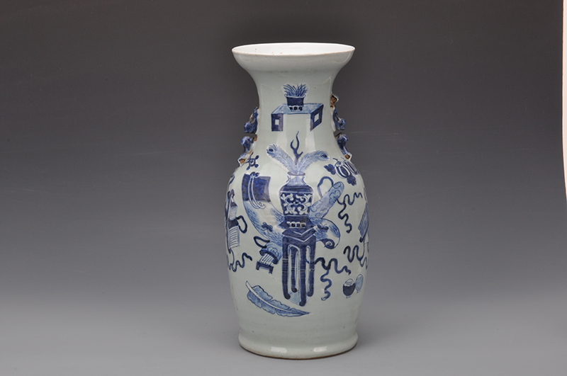 民国豆青地青花博古图螭耳瓶