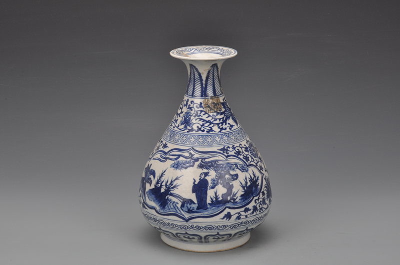 现代青花开光人物玉壶春瓶