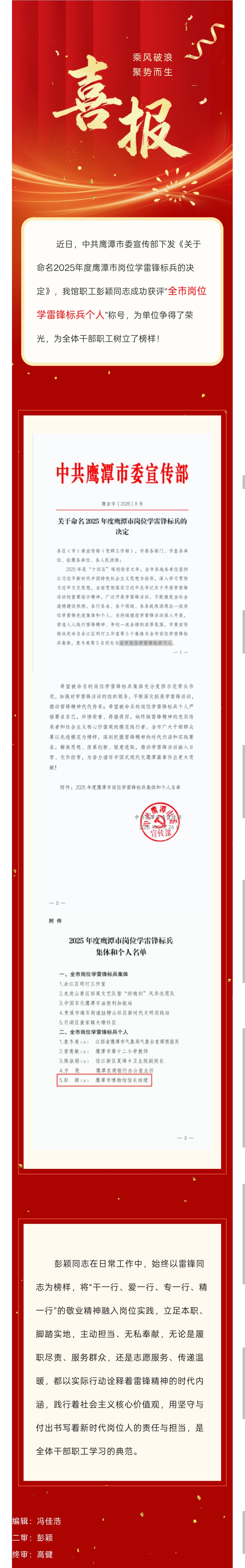 喜报!我馆彭颖荣获2025年度全市岗位学雷锋标兵个人称号
